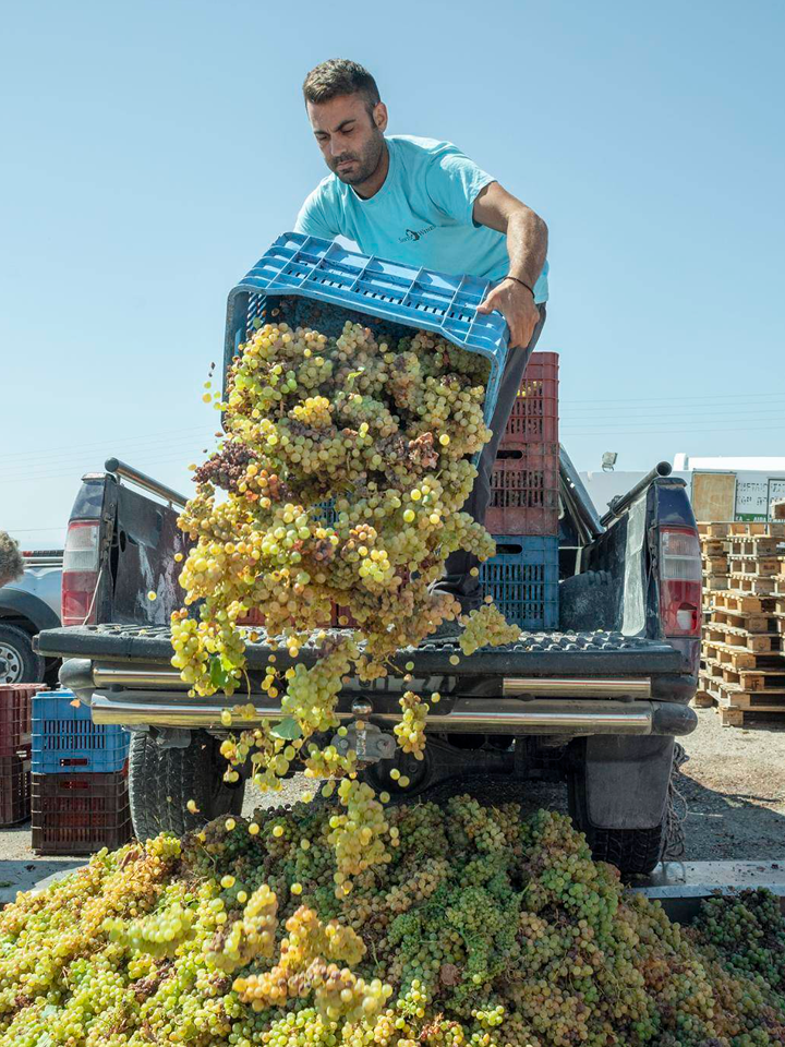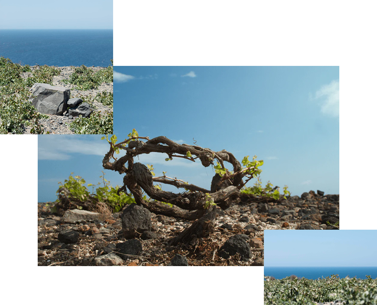 The Santorini Grape indigenous to this beautiful island, is an ancient vine variety with 3,500 years of history. Cultivated in arid volcanic-ash-rich soil, the vineyards are misted by the Aegean Sea to grow into basket-like cylinders, to defend themselves against the intense sun and the harsh Cycladic winds.