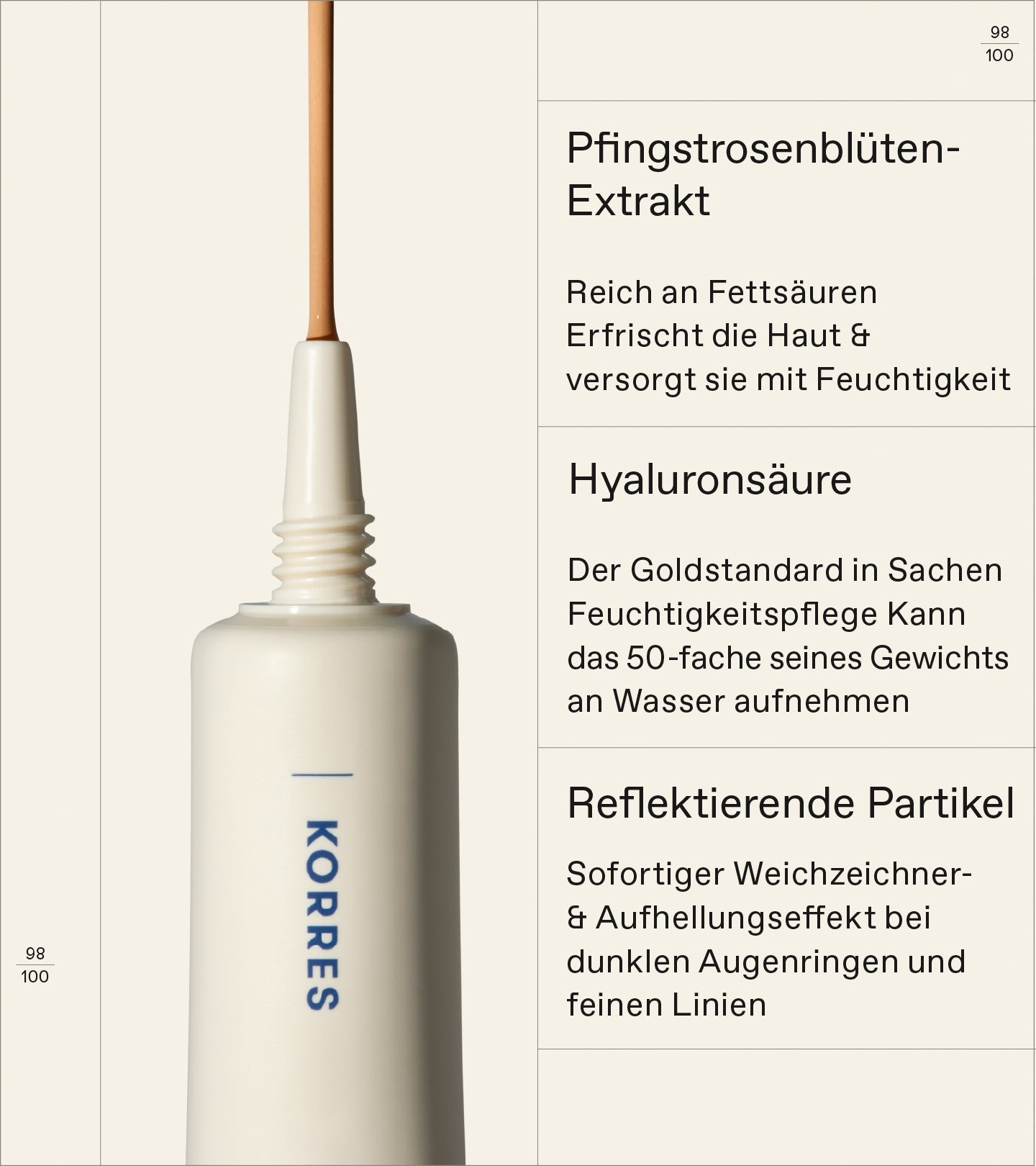 Ein cremiger, leichter Concealer mit mittlerer Deckkraft und einem natürlich leuchtenden Finish. Mit Pfingstrosen-Blütenextrakt, feuchtigkeitsspendender Hyaluronsäure und reflektierenden Partikeln kaschiert er sofort das Erscheinungsbild dunkler Augenringe und bietet eine langanhaltende, faltenfreie Abdeckung.