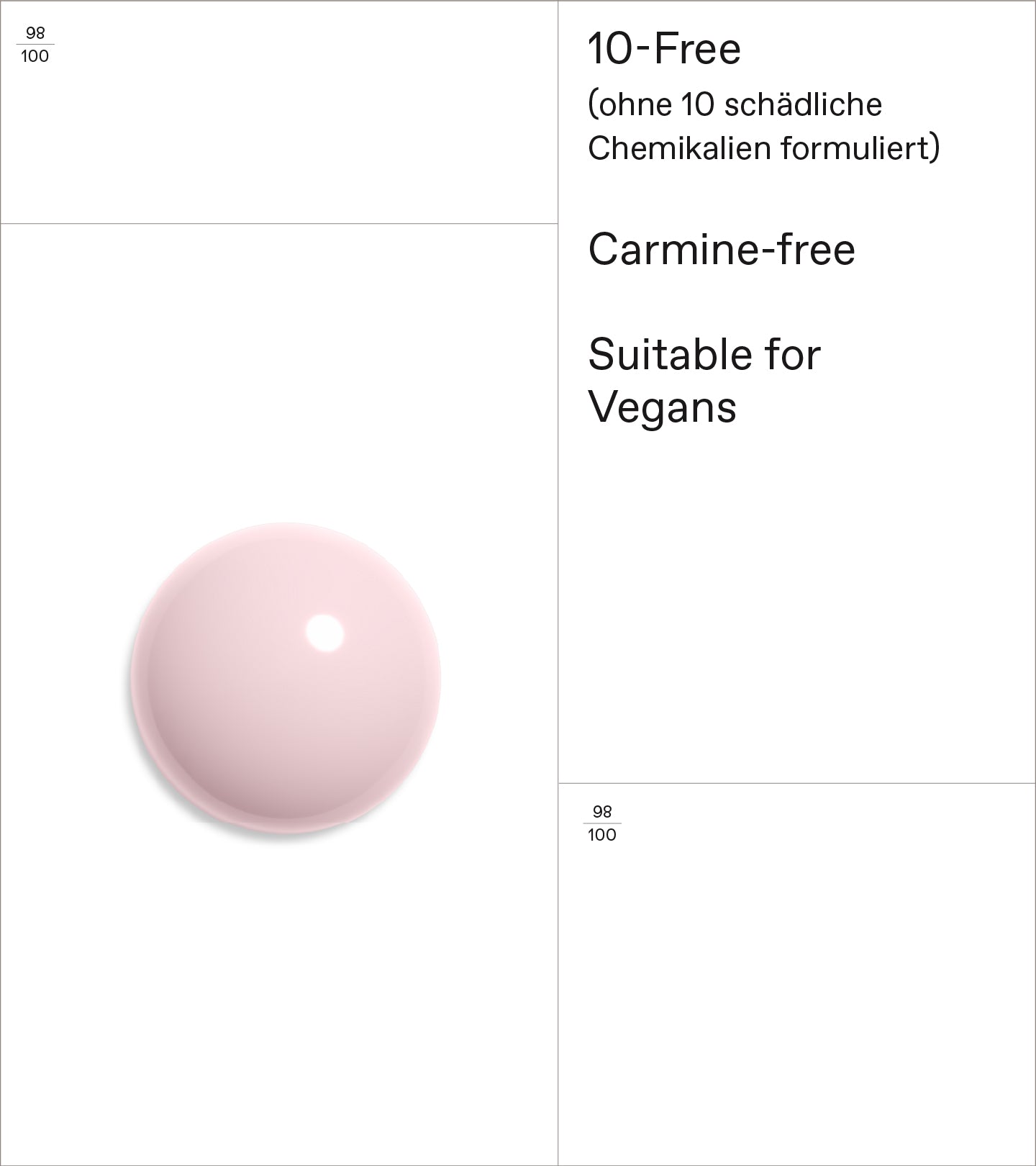Schnell trocknend, extrem widerstandsfähig, splitterfest und intensiv glänzend. Frei von 10 schädlichen Chemikalien (10-Free) und angereichert mit Süß-Mandelöl und Filmbildnern auf Pflanzenbasis nährt und pflegt er die Nägel und verleiht ihnen einen brillianten Glanz.
