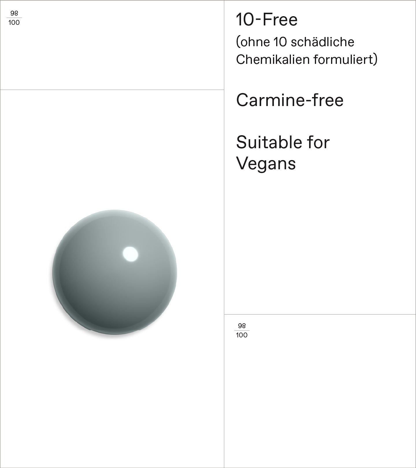 Schnell trocknend, extrem widerstandsfähig, splitterfest und intensiv glänzend. Frei von 10 schädlichen Chemikalien (10-Free) und angereichert mit Süß-Mandelöl und Filmbildnern auf Pflanzenbasis nährt und pflegt er die Nägel und verleiht ihnen einen brillianten Glanz.