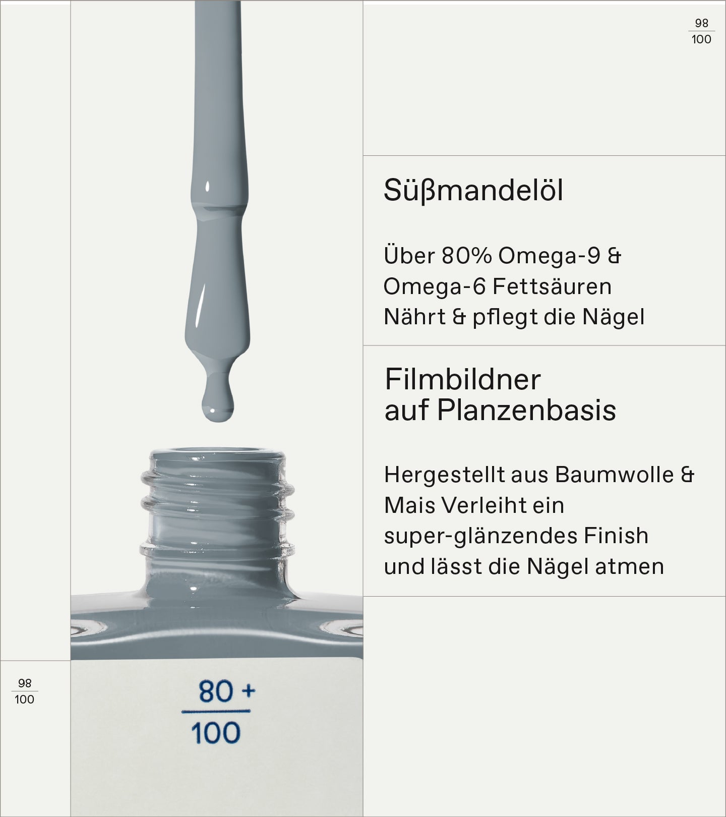 • Süßmandelöl – Über 80 % ω-9- und ω-6-Fettsäuren Pflegt und stärkt die Nägel